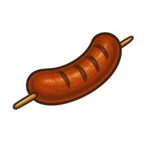 Salchicha polaca asada a las brasas hasta alcanzar ese tono rojizo y textura firme, con suaves vetas ahumadas y piel crujiente — un bocado sabroso y contundente.