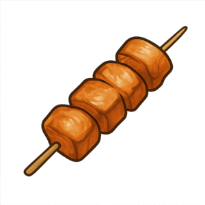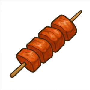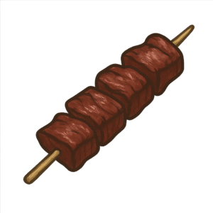Trozos de churrasco de res, asados a fuego fuerte, logrando ese sellado exterior mientras quedan jugosos por dentro – un pincho con sabor fuerte a parrilla .